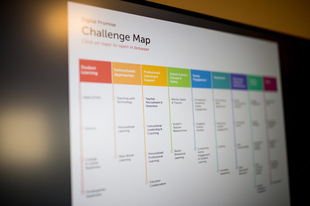 Through the Challenge Map, Digital Promise hopes to encourage schools, publishers, researchers, and funders to move teachers and students and their needs to the top of the research process. The map features nine broad themes with 35 specific challenges. It contains background materials on each challenge and additional resources. Digital Promise’s team identified the challenges through a series of surveys, focus groups, and interviews with leaders from the League of Innovative Schools and external experts.