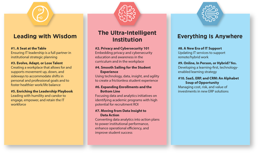During a preview of the list during Educause’s annual conference last week in Denver, Susan Grajek, the group’s vice president for partnerships, communities and research, said that as hybrid learning and working takes hold, IT leaders need to keep up.